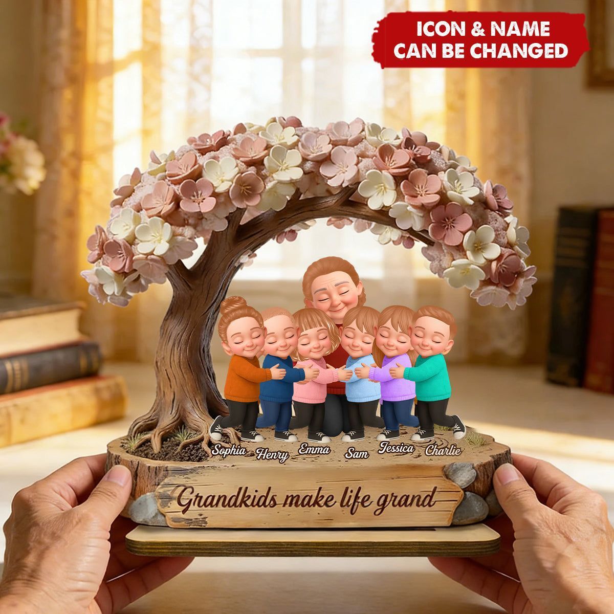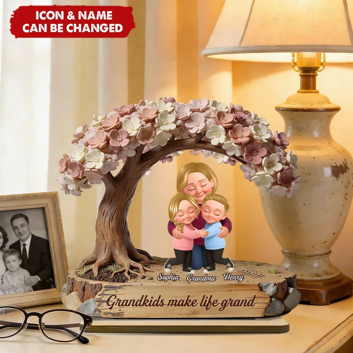 Oma und Enkelkinder unter Blüten baum-personal isierte 2-lagige Holzplatte-Geschenk für Mama